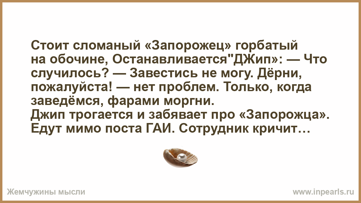 Стоит сломаный «Запорожец» горбатый на обочине, Останавливается"ДЖип»: — Что случилось? — Завестись не могу. Дёрни, пожалуйста! — нет проблем. Только, когда заведёмся, фарами моргни.