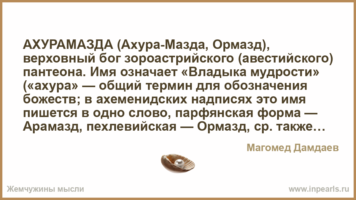 АХУРАМАЗДА (Ахура-Мазда, Ормазд), верховный бог зороастрийского (авестийского) пантеона. Имя означает «Владыка мудрости» («ахура» — общий термин для обозначения божеств; в ахеменидских надписях это имя пишется в одно слово, парфянская форма — Арамазд, пехлевийская — Ормазд, ср. также греч.). Впервые засвидетельствовано в ассир. надписи 8 в. до н. э. как имя одного из мидийских божеств. Пророк Заратуштра (Зороастр) придал его культу универсальный характер, и в таком виде он начал распространяться в Зап. Иране лишь с 6 в. до н. э. По учению Зороастра, Ахурамазда– единственный всемогущий и всезнающий бог добра, олицетворяющий свет, жизнь и правду. Он существовал вечно и был творцом мира и шести великих благих божеств, которые являлись различными его эманациями. Но наряду с ним изначально существовал и Ангхроманью (Ангхро Манью, Ариман) — злой дух, который олицетворял мрак и смерть и вместе с дэвами творил зло. Они непрерывно борются между собой, и в этой борьбе Ахурамазда опирается на своих помощников, которые олицетворяют добромыслие, правду и бессмертие (триада зороастрийской этики). Человек создан им, но свободен в выборе между добром и злом. Зороастр призывал людей бороться против духов зла своими мыслями, словами и делами. Культ Ахурамазда получил широкое распространение у мн. иран. народов и особенно при дворе ахеменидских, парфянских и сасанидских царей. Напр., Дарий I в своих надписях постоянно упоминает его как творца земли, неба, людей и счастья для них, а также приписывает все свои завоевания и достижения неизменной и щедрой помощи этого бога.
