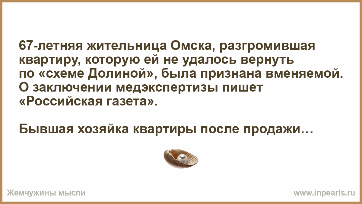 67-летняя жительница Омска, разгромившая квартиру, которую ей не удалось вернуть по «схеме Долиной», была признана вменяемой. О заключении медэкспертизы пишет «Российская газета».