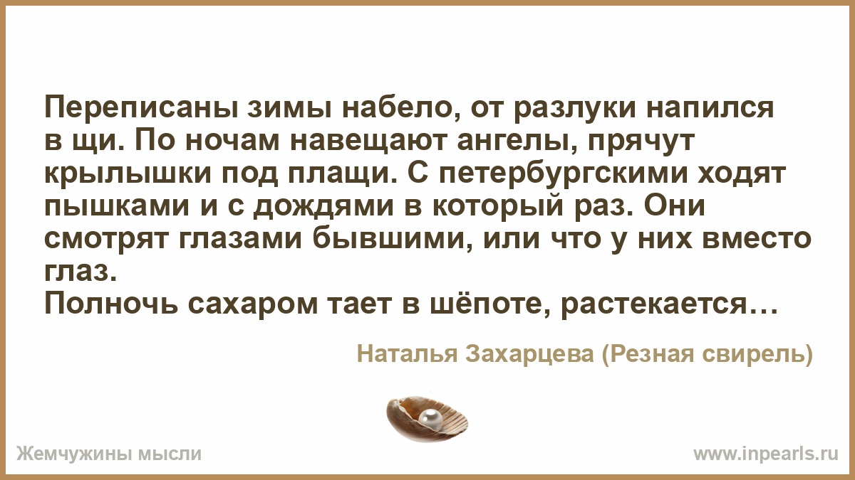 Переписаны зимы набело, от разлуки напился в щи. По ночам навещают ангелы, прячут крылышки под плащи. С петербургскими ходят пышками и с дождями в который раз. Они смотрят глазами бывшими, или что у них вместо глаз.