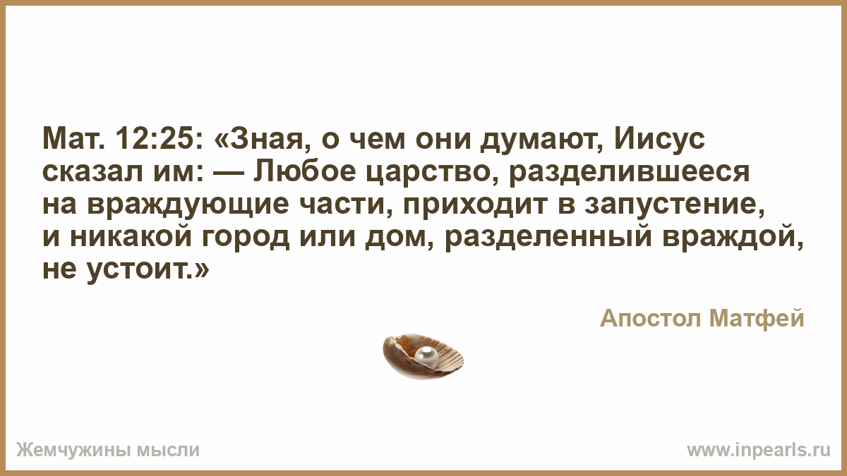 Мат. 12:25: «Зная, о чем они думают, Иисус сказал им: — Любое царство, разделившееся на враждующие части, приходит в запустение, и никакой город или дом, разделенный враждой, не устоит.»