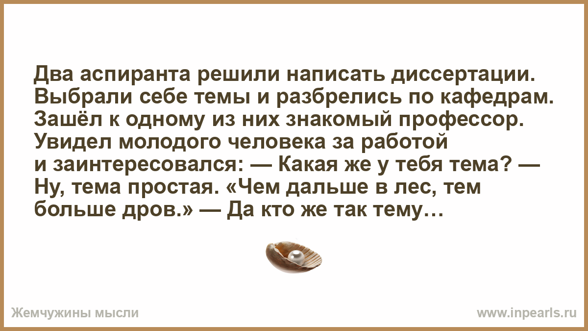 Два аспиранта решили написать диссертации. Выбрали себе темы и разбрелись по кафедрам. Зашёл к одному из них знакомый профессор. Увидел молодого человека за работой и заинтересовался: — Какая же у тебя тема? — Hу, тема простая. «Чем дальше в лес, тем больше дров.» — Да кто же так тему формулирует? Hадо по- научному, посолиднее. К примеру, «О нарастании топливных ресурсов с продвижением вглубь лесного массива»… — Ух ты! — обрадовался аспирант, с трудом узнавая родную тему.