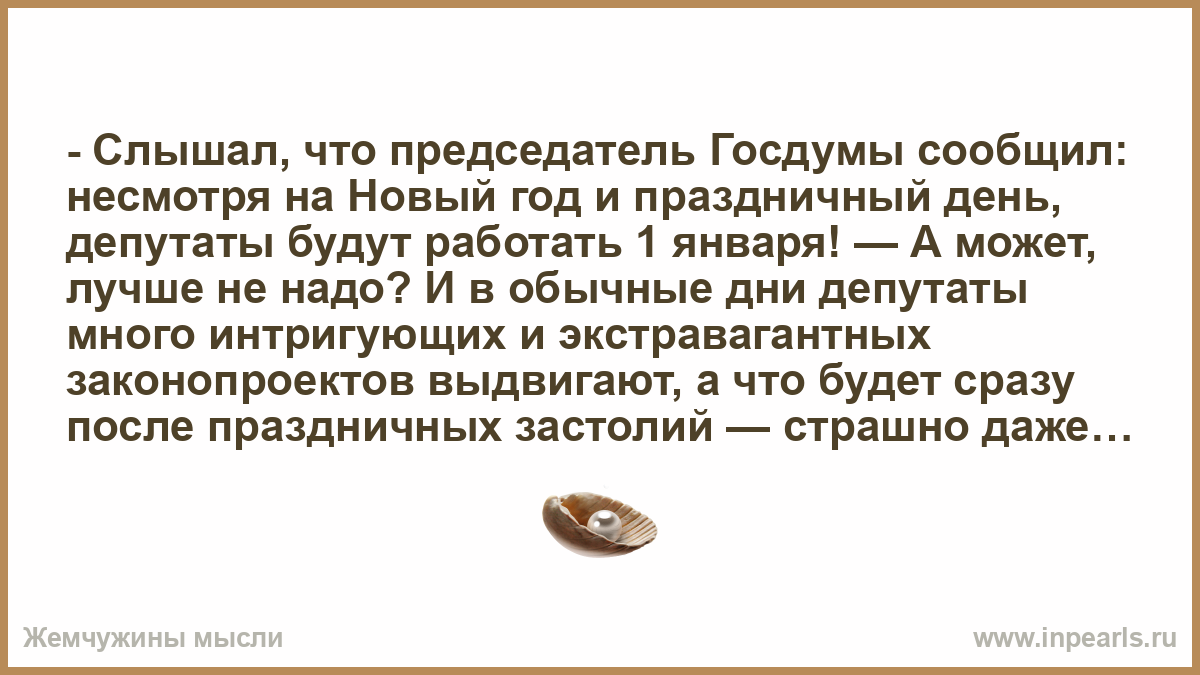 - Слышал, что председатель Госдумы сообщил: несмотря на Новый год и праздничный день, депутаты будут работать 1 января! — А может, лучше не надо? И в обычные дни депутаты много интригующих и экстравагантных законопроектов выдвигают, а что будет сразу после праздничных застолий — страшно даже представить…