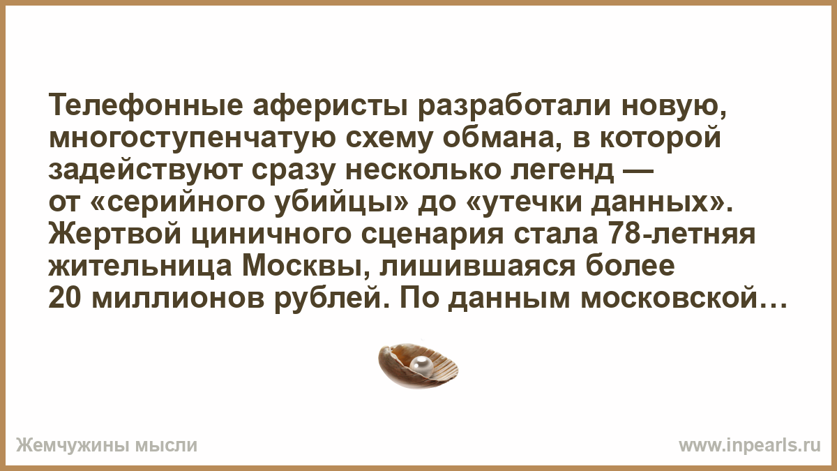 Телефонные аферисты разработали новую, многоступенчатую схему обмана, в которой задействуют сразу несколько легенд — от «серийного убийцы» до «утечки данных». Жертвой циничного сценария стала 78-летняя жительница Москвы, лишившаяся более 20 миллионов рублей. По данным московской прокуратуры, злоумышленники начали «обработку» с ложного звонка от якобы участкового полиции. Аферист напугал пенсионерку сообщением о том, что в её районе орудует опасный убийца, и попросил сохранять бдительность. Уже на следующий день «легенда» получила развитие: женщине позвонил неизвестный и под угрозой расправы потребовал 500 тысяч рублей. Доверчивая москвичка немедленно сообщила об этом своему «участковому», который убедил её подыграть преступнику ради спецоперации по его поимке. После передачи первого транша курьеру схема сделала неожиданный поворот. Организаторы заявили, что «операция пошла не по плану» и персональные данные пенсионерки утекли к мошенникам. Чтобы «спасти» накопления, женщине предложили передать все средства якобы инкассаторам для помещения на безопасный счёт. Введенная в заблуждение жертва, полагая, что спасает свои деньги, добровольно отдала прибывшим курьерам более 20 миллионов рублей.