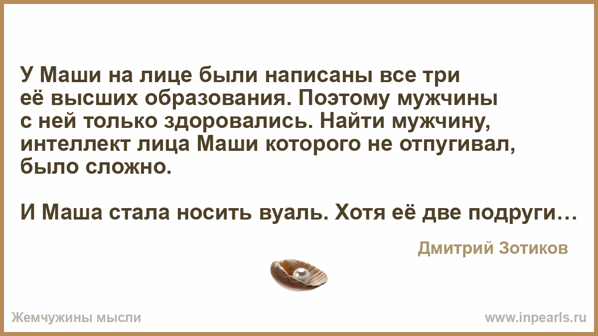 У Маши на лице были написаны все три её высших образования. Поэтому мужчины с ней только здоровались. Найти мужчину, интеллект лица Маши которого не отпугивал, было сложно.