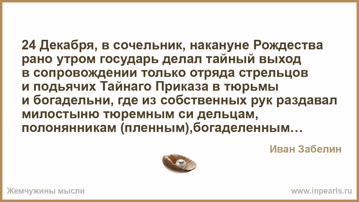 24 Декабря, в сочельник, накануне Рождества рано утром государь делал тайный выход в сопровождении только отряда стрельцов и подьячих Тайнаго Приказа в тюрьмы и богадельни, где из собственных рук раздавал милостыню тюремным си дельцам, полонянникам (пленным),богаделенным, увечным и всяким бедным людям. По самым улицам, где проходил государь, он также раздавал милостыню нищим и убогим, которые во множестве собирались даже из отдаленных мест к таким боголюбивым царским выходам. В то же время, как государь на вещал таким образом всех заключенных и сирых, доверенный лица из стрелецких полковников или подьячих Тайнаго Приказа раздавали милостыню на Земском дворе, также и у Лобнаго места, и на Красной площади. И можно сказать, что ни один