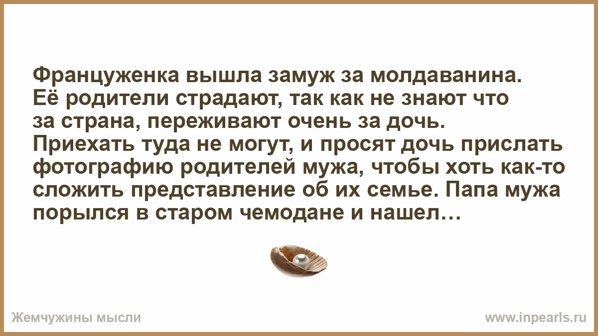 Приехать туда не могут, и просят дочь прислать фотографию родителей мужа, чтобы хоть как-то сложить представление об их семье. Папа мужа порылся в старом чемодане и нашел классическую фотку: папа на стуле, мама стоит сзади-сбоку, держится рукой за плечо. anekdotov.net, Приходит ответ от родителей французов. Те в шоке.