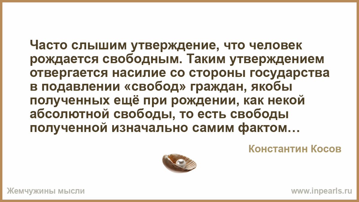 Часто слышим утверждение, что человек рождается свободным. Таким утверждением отвергается насилие со стороны государства в подавлении «свобод» граждан, якобы полученных ещё при рождении, как некой абсолютной свободы, то есть свободы полученной изначально самим фактом рождения.