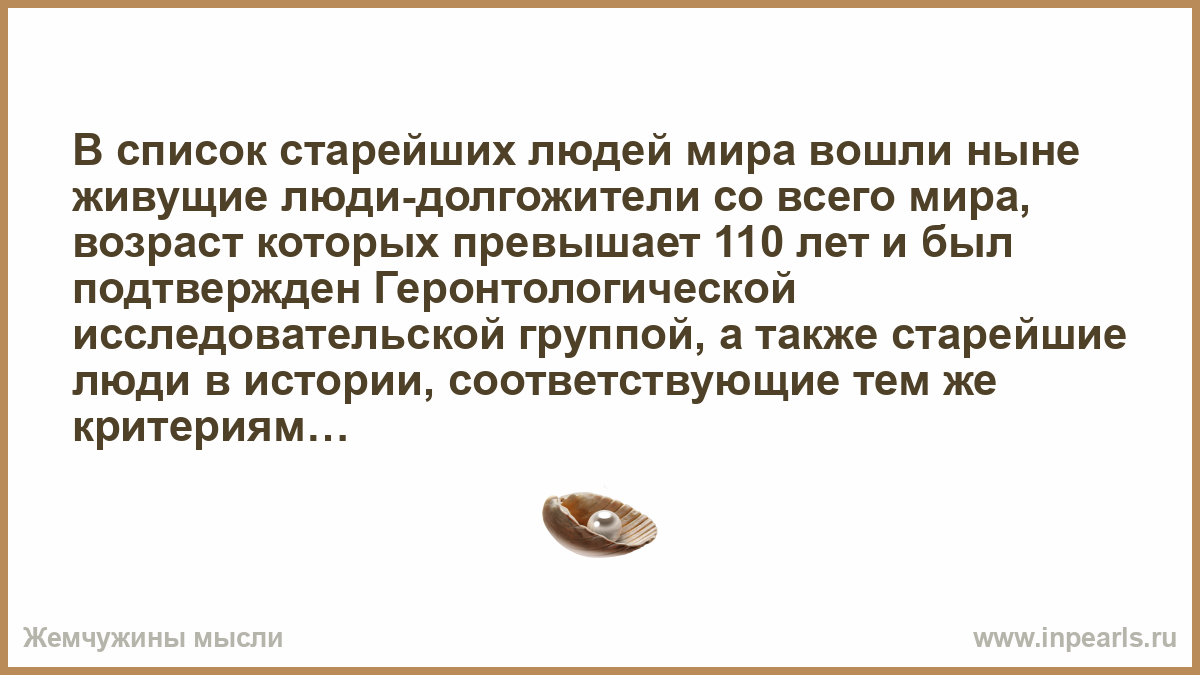 В список старейших людей мира вошли ныне живущие люди-долгожители со всего мира, возраст которых превышает 110 лет и был подтвержден Геронтологической исследовательской группой, а также старейшие люди в истории, соответствующие тем же критериям.