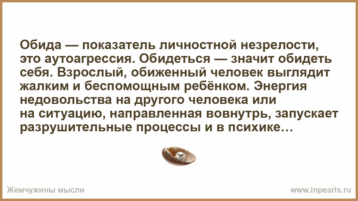 Обида — показатель личностной незрелости, это аутоагрессия. Обидеться — значит обидеть себя. Взрослый, обиженный человек выглядит жалким и беспомощным ребёнком. Энергия недовольства на другого человека или на ситуацию, направленная вовнутрь, запускает разрушительные процессы и в психике, и в теле.