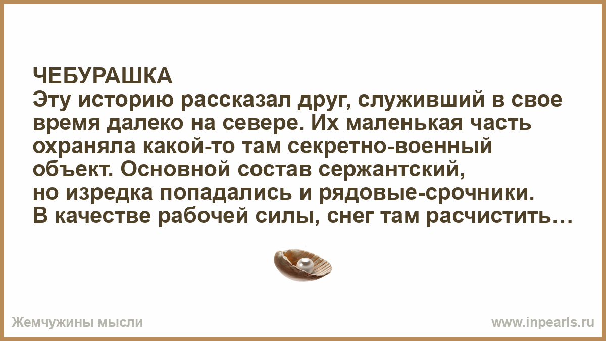 Вызывает командир: — Рядовой —————! Вы почему плохо справляетесь со своими обязанностями? — Виноват, — Чебурашка бледнеет и судорожно пытается сообразить — в чем же он накосячил, — А… разрешите обратиться… что именно я не сделал? — ПОЧЕМУ У СОБАК ЗУБЫ НЕ ЧИЩЕНЫ? — Э… виноват трщ командир, исправлюсь.