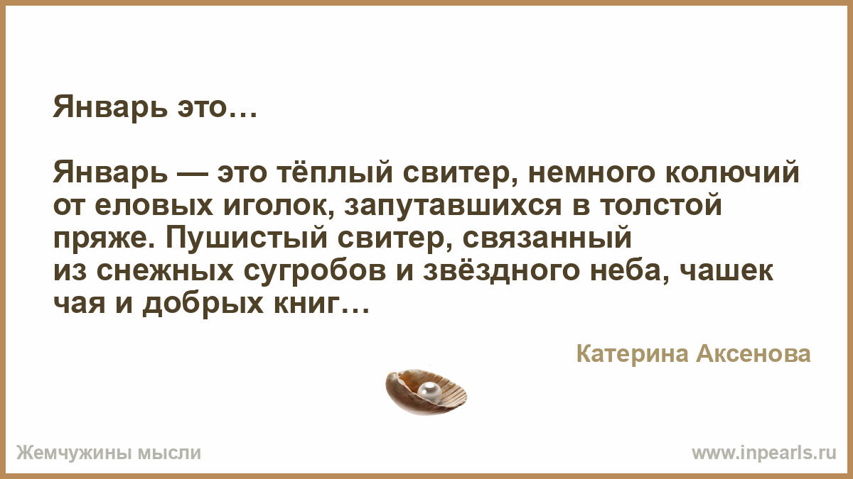 Январь — это тёплый свитер, немного колючий от еловых иголок, запутавшихся в толстой пряже. Пушистый свитер, связанный из снежных сугробов и звёздного неба, чашек чая и добрых книг.