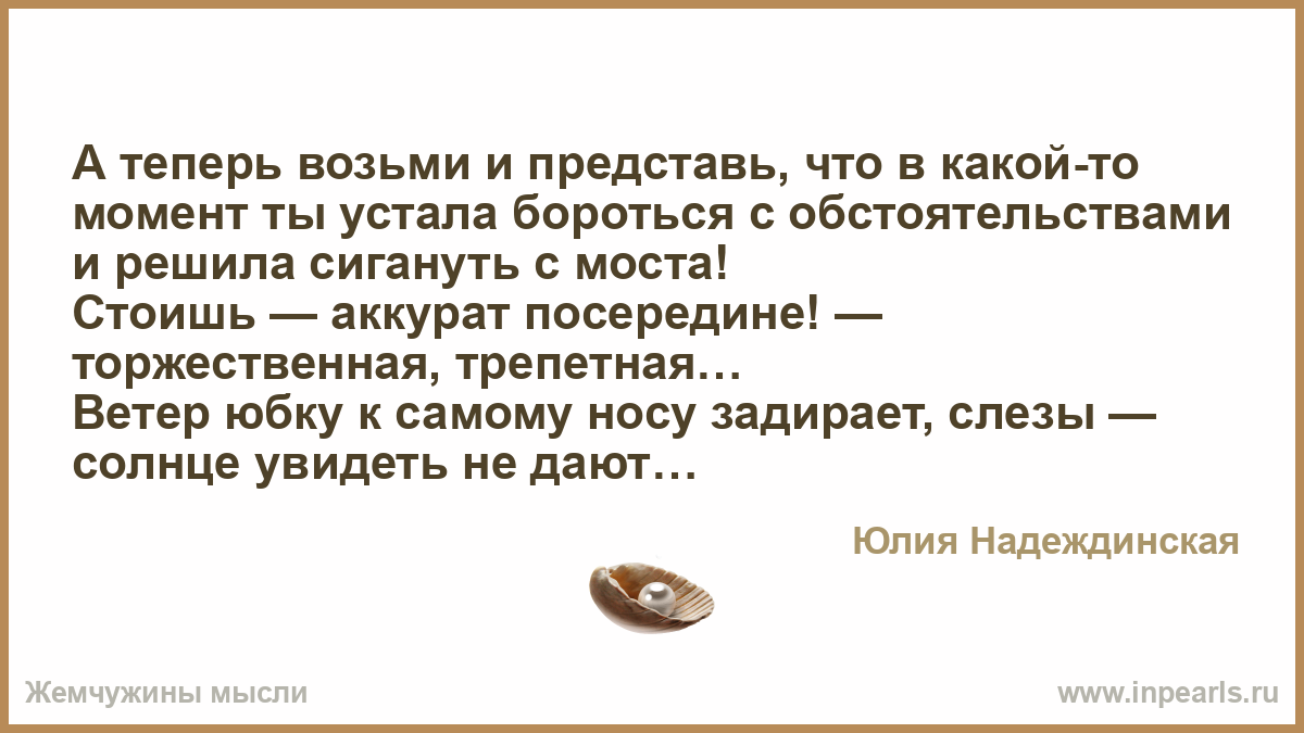 А теперь возьми и представь, что в какой-то момент ты устала бороться с обстоятельствами и решила сигануть с моста!