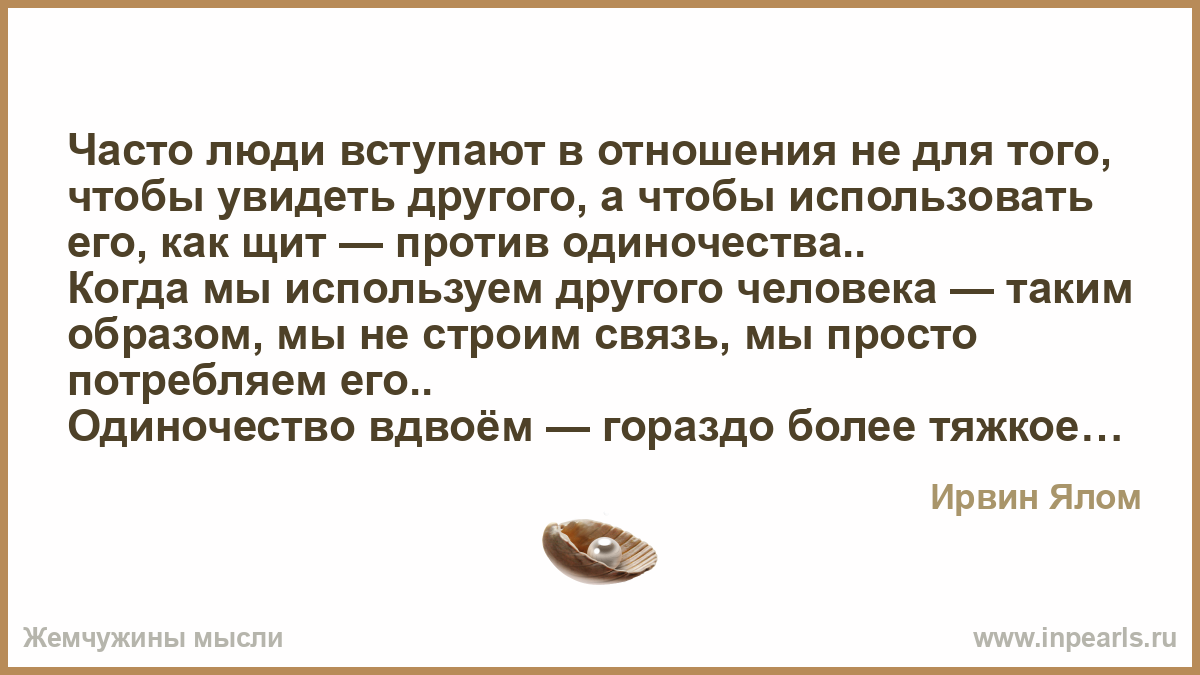 Часто люди вступают в отношения не для того, чтобы увидеть другого, а чтобы использовать его, как щит — против одиночества..