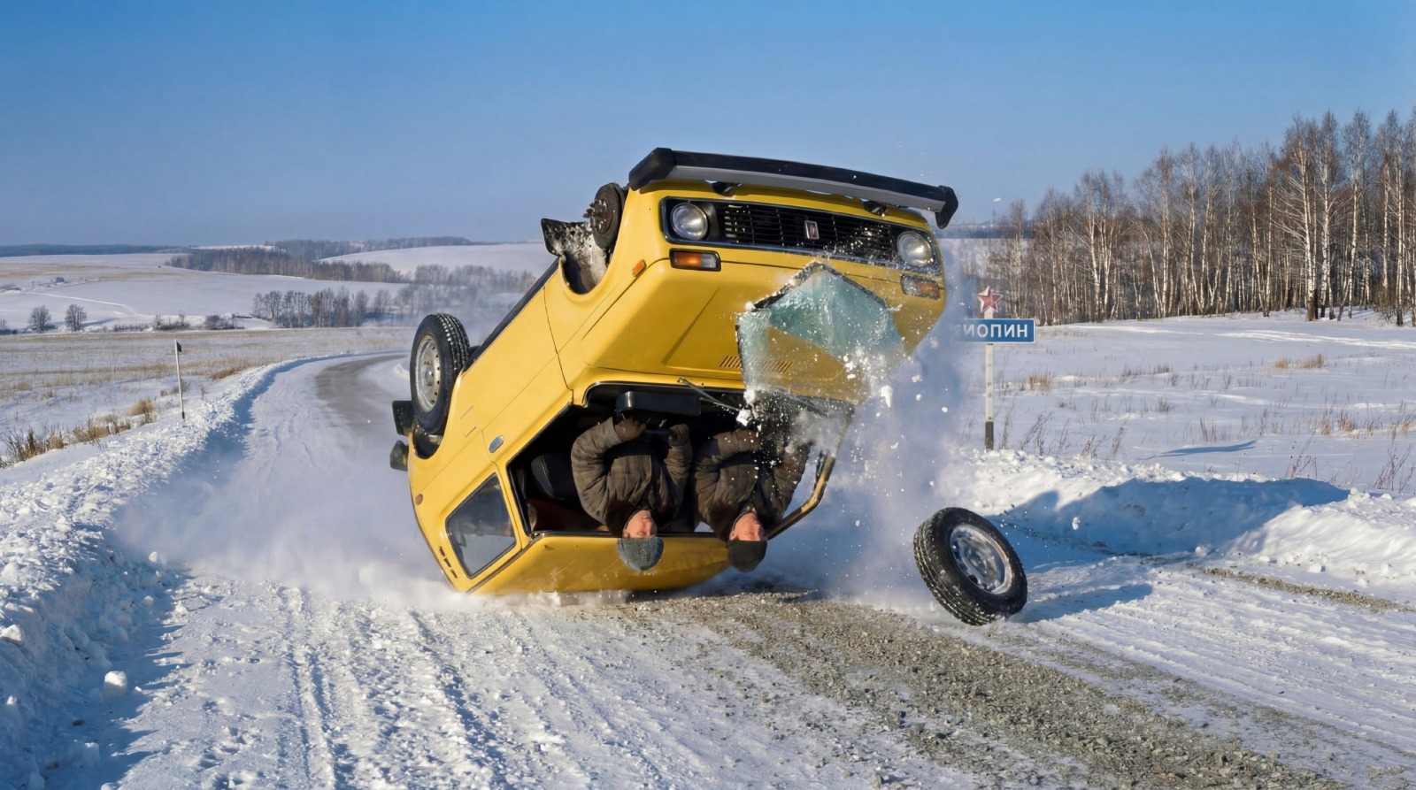 Картинка была драматичной: снег кружился вокруг, как будто сам природа удивлялась тому, что произошло. Машина, перевернувшись, лежала на крыше, а Анатолий, словно супергерой, выскочил на свободу, оставив за собой лишь облако снега.