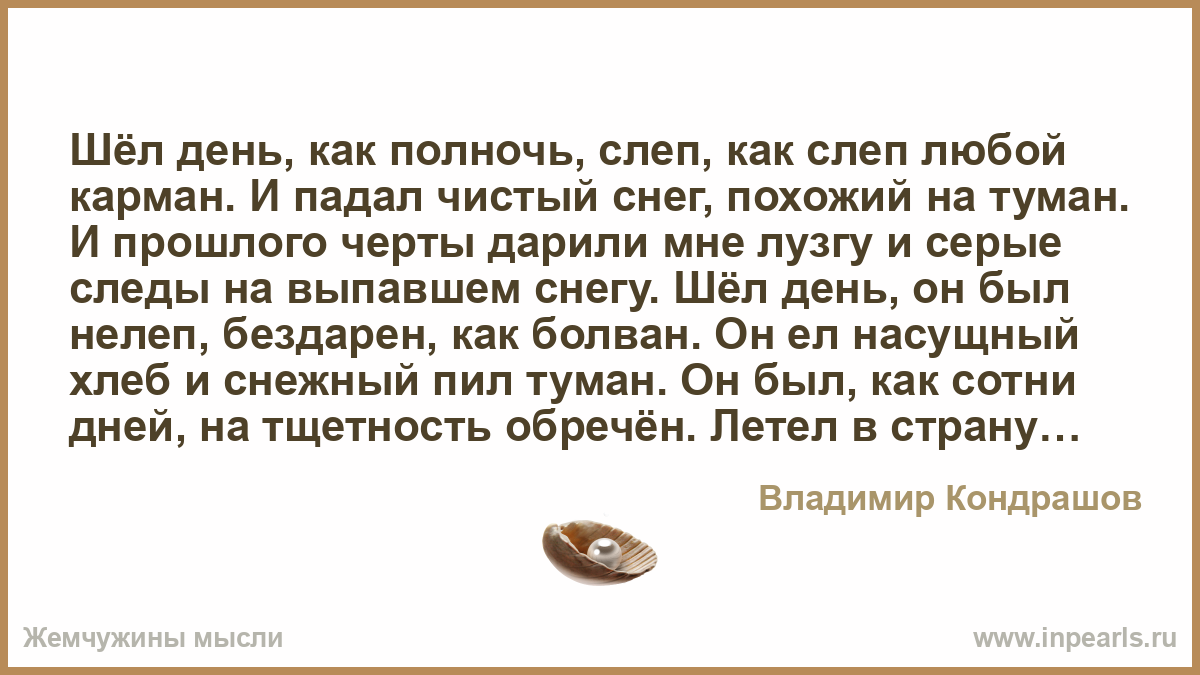 Шёл день, как полночь, слеп, как слеп любой карман. И падал чистый снег, похожий на туман. И прошлого черты дарили мне лузгу и серые следы на выпавшем снегу. Шёл день, он был нелеп, бездарен, как болван. Он ел насущный хлеб и снежный пил туман. Он был, как сотни дней, на тщетность обречён. Летел в страну теней, не думал ни о чём. Лишь говорил, что высь с него, пустого дня, хоть сотни лет молись, покинула меня. Ну что же, ну и пусть. Нет дыма без костра. По снегу будет путь мне с грязного листа.