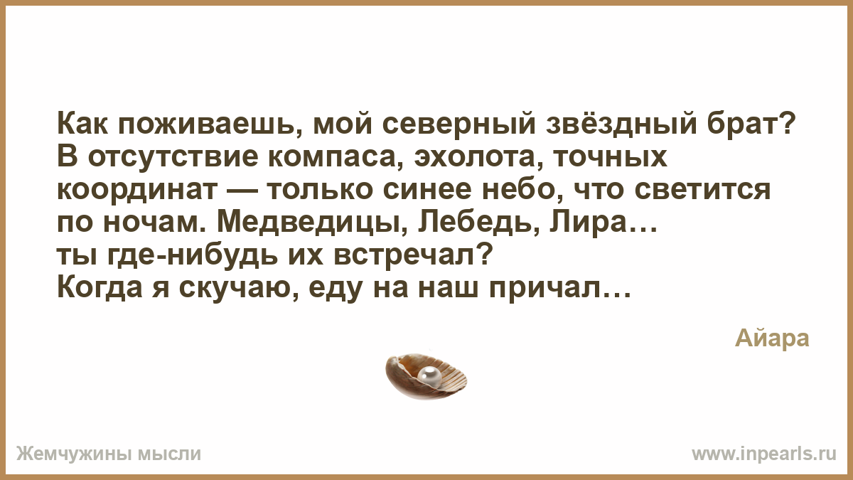 Как поживаешь, мой северный звёздный брат? В отсутствие компаса, эхолота, точных координат — только синее небо, что светится по ночам. Медведицы, Лебедь, Лира… ты где-нибудь их встречал?