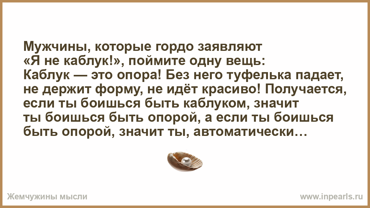 Каблук — это опора! Без него туфелька падает, не держит форму, не идёт красиво! Получается, если ты боишься быть каблуком, значит ты боишься быть опорой, а если ты боишься быть опорой, значит ты, автоматически, становишься нагрузкой! Дело не в слове, а в мужчине! Если мужчине жалко денег на свою семью, это не осторожность, это страх ответственности. Если мужчина считается с мнением жены, он не «прогнулся», он выбрал партнерство. Мужчина не теряет лицо, если выбирает семью вместо тусовки. Он теряет лицо, если боится, что друзья перестанут считать его «своим». Если женщина рядом с мужчиной постоянно напрягается, ходит аккуратно, боится сказать тебе что-то лишнее, то это не она удобная, это мужчина рядом с ней — не безопасный. Мужчина, рядом с которым женщина спокойна, любима и защищена, не теряет власть, он её создаёт!