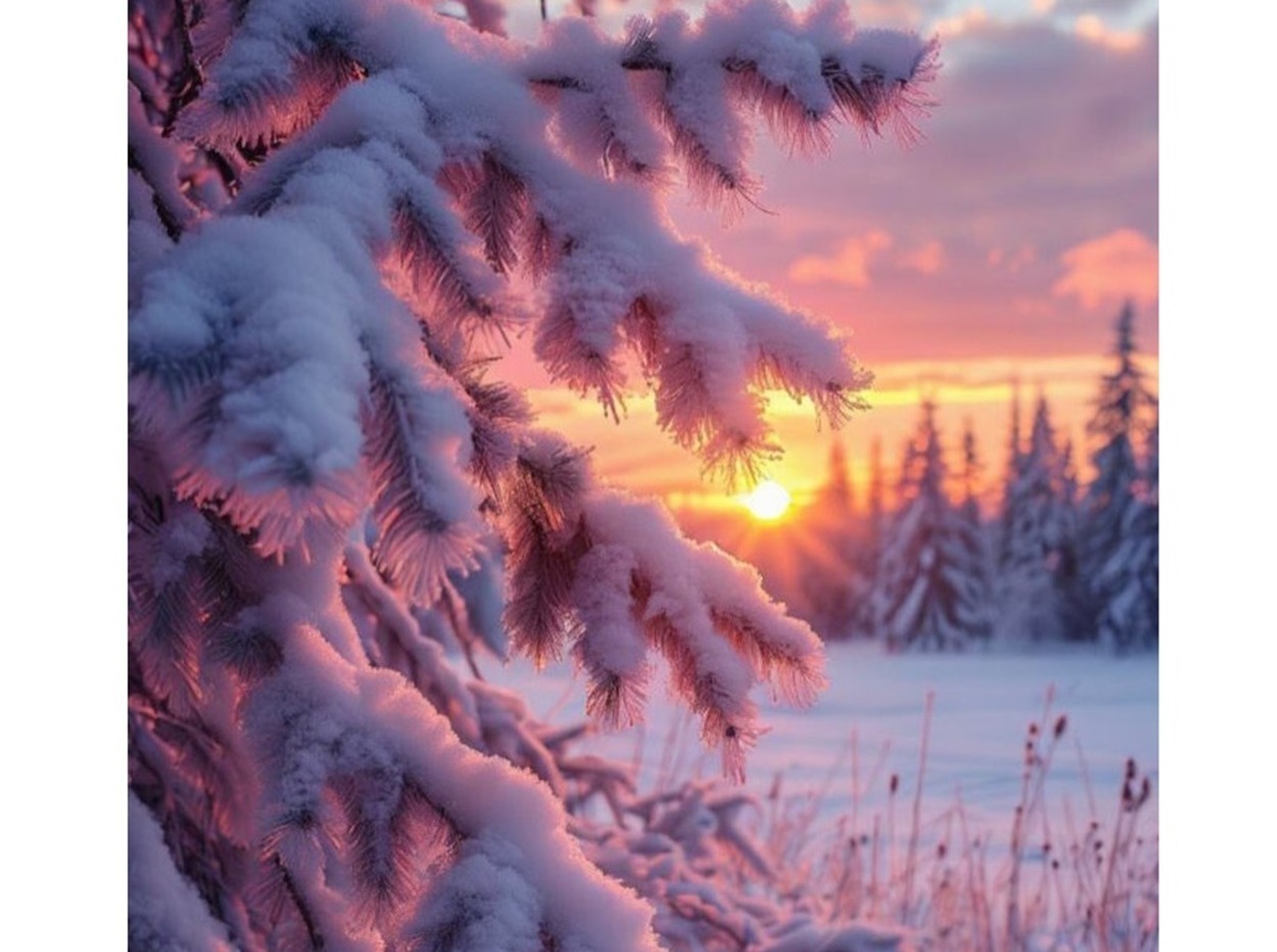 Красивый вечер… Его творит живописец — художник закат! Он на верхушках елей нанес акварельный миг божественными лучами окрасив снег, деревья в космические краски.