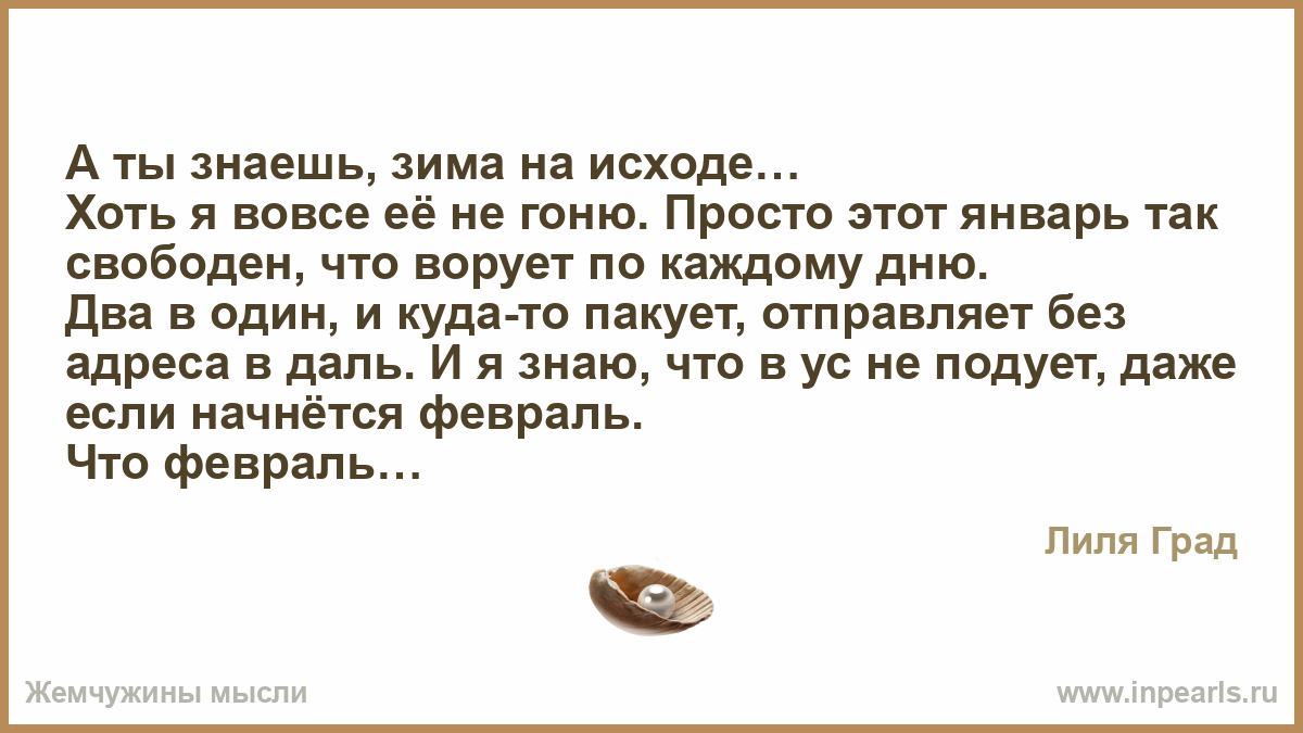 Мне говорит: я побуду ещё, да и ты не спеши. Как вы мне все надоели, фанаты весны и её вековые страдальцы. Вы б отыскали немного терпенья в застенках бессмертной души.