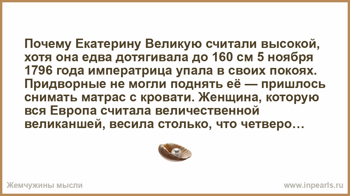 Почему Екатерину Великую считали высокой, хотя она едва дотягивала до 160 см 5 ноября 1796 года императрица упала в своих покоях. Придворные не могли поднять её — пришлось снимать матрас с кровати. Женщина, которую вся Европа считала величественной великаншей, весила столько, что четверо мужчин еле справились.