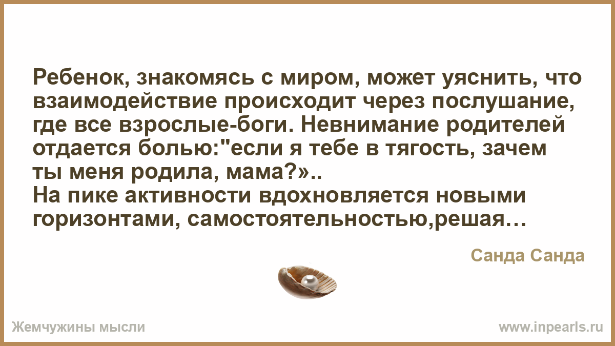 Ребенок, знакомясь с миром, может уяснить, что взаимодействие происходит через послушание, где все взрослые-боги. Невнимание родителей отдается болью:"если я тебе в тягость, зачем ты меня родила, мама?»..