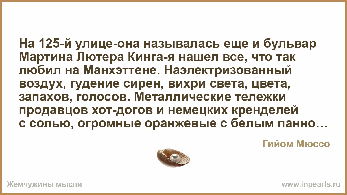 На 125-й улице-она называлась еще и бульвар Мартина Лютера Кинга-я нашел все, что так любил на Манхэттене. Наэлектризованный воздух, гудение сирен, вихри света, цвета, запахов, голосов. Металлические тележки продавцов хот-догов и немецких кренделей с солью, огромные оранжевые с белым панно, плюмажи белого дыма, несмолкаемое журчание продавцов, сидящих под ветхими зонтиками и желающих всучить вам свой товар… Словом, непередаваемое, пьянящее ощущение чудесно организованного хаоса.