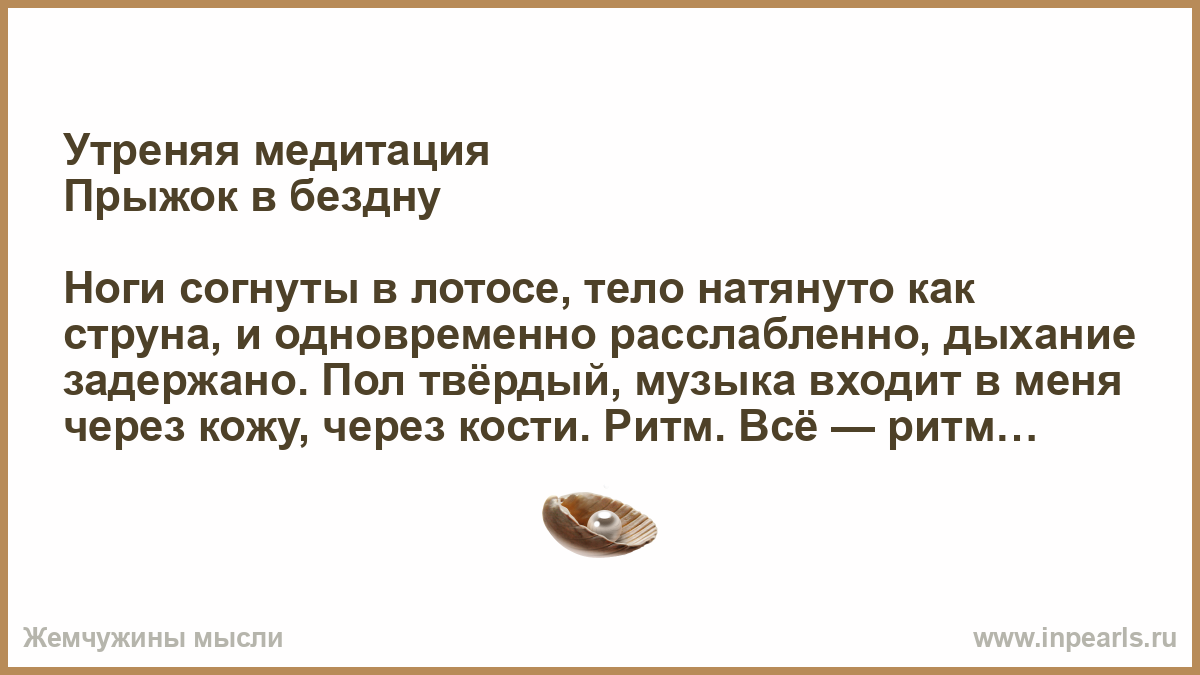 Ноги согнуты в лотосе, тело натянуто как струна, и одновременно расслабленно, дыхание задержано. Пол твёрдый, музыка входит в меня через кожу, через кости. Ритм. Всё — ритм. Сердце, дыхание, удары барабана. Я жду момента. Не того момента, когда решу прыгнуть. Того, когда прыжок решит случиться. — Кто прыгает?