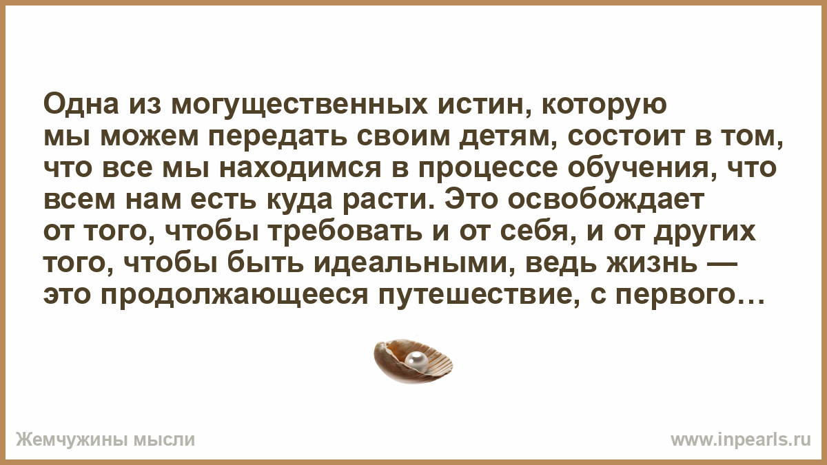 Одна из могущественных истин, которую мы можем передать своим детям, состоит в том, что все мы находимся в процессе обучения, что всем нам есть куда расти. Это освобождает от того, чтобы требовать и от себя, и от других того, чтобы быть идеальными, ведь жизнь — это продолжающееся путешествие, с первого и до последнего дня.