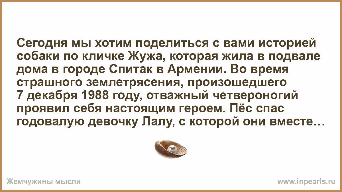 Сегодня мы хотим поделиться с вами историей собаки по кличке Жужа, которая жила в подвале дома в городе Спитак в Армении. Во время страшного землетрясения, произошедшего 7 декабря 1988 году, отважный четвероногий проявил себя настоящим героем. Пёс спас годовалую девочку Лалу, с которой они вместе оказались под обломками жилого дома.