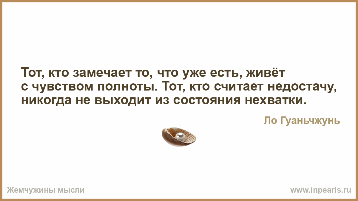 Тот, кто замечает то, что уже есть, живёт с чувством полноты. Тот, кто считает недостачу, никогда не выходит из состояния нехватки.