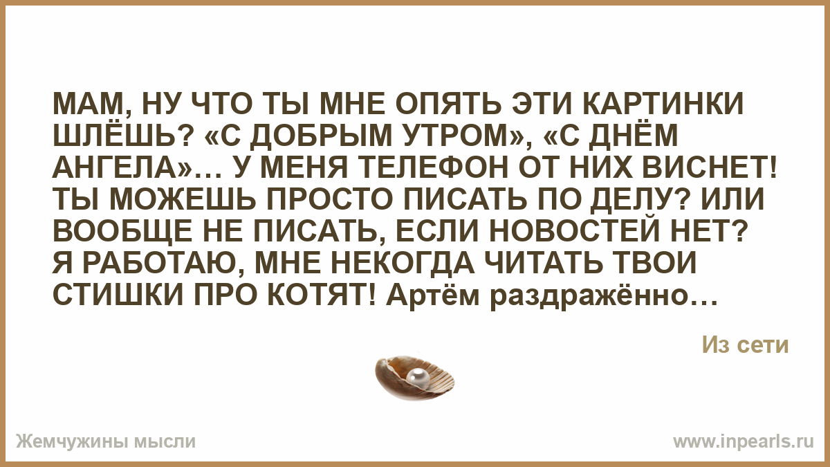 МАМ, НУ ЧТО ТЫ МНЕ ОПЯТЬ ЭТИ КАРТИНКИ ШЛЁШЬ? «С ДОБРЫМ УТРОМ», «С ДНЁМ АНГЕЛА»… У МЕНЯ ТЕЛЕФОН ОТ НИХ ВИСНЕТ! ТЫ МОЖЕШЬ ПРОСТО ПИСАТЬ ПО ДЕЛУ? ИЛИ ВООБЩЕ НЕ ПИСАТЬ, ЕСЛИ НОВОСТЕЙ НЕТ? Я РАБОТАЮ, МНЕ НЕКОГДА ЧИТАТЬ ТВОИ СТИШКИ ПРО КОТЯТ! Артём раздражённо бросил смартфон на стол. Экран ещё светился, показывая открытку с пушистым зайцем и надписью: «Пусть день будет солнечным!».Ему было тридцать пять. Он был ведущим программистом в крупной IT-компании. Его жизнь состояла из дедлайнов, зум-колов, спринтов и бесконечного потока информации. Его мама, Вера Павловна, жила в маленьком посёлке за триста километров. Она освоила WhatsApp полгода назад, когда Артём подарил ей свой старый смартфон. И с тех пор его жизнь превратилась в ад из гифок. Каждое утро начиналось с «чашечки кофе» в пикселях. Каждый вечер заканчивался «ангелом-хранителем».Артём сначала вежливо отвечал смайликами. Потом стал игнорировать. А сегодня сорвался.