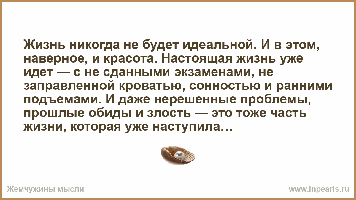 Жизнь никогда не будет идеальной. И в этом, наверное, и красота. Настоящая жизнь уже идет — с не сданными экзаменами, не заправленной кроватью, сонностью и ранними подъемами. И даже нерешенные проблемы, прошлые обиды и злость — это тоже часть жизни, которая уже наступила