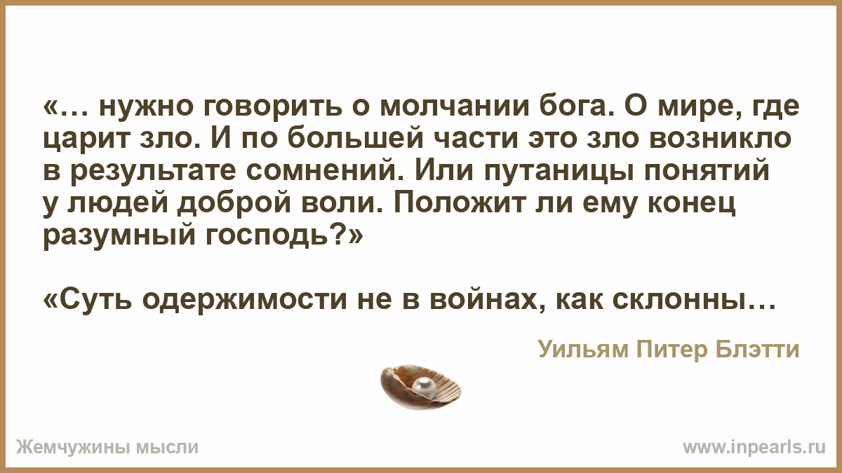«… нужно говорить о молчании бога. О мире, где царит зло. И по большей части это зло возникло в результате сомнений. Или путаницы понятий у людей доброй воли. Положит ли ему конец разумный господь?»
