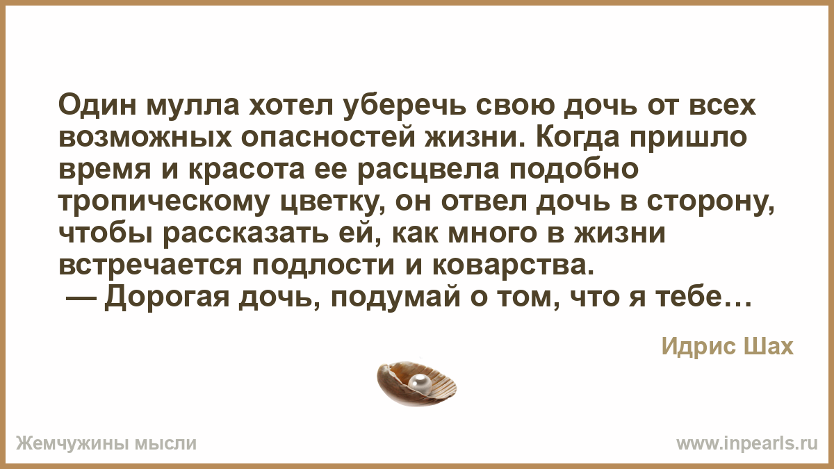 Один мулла хотел уберечь свою дочь от всех возможных опасностей жизни. Когда пришло время и красота ее расцвела подобно тропическому цветку, он отвел дочь в сторону, чтобы рассказать ей, как много в жизни встречается подлости и коварства.