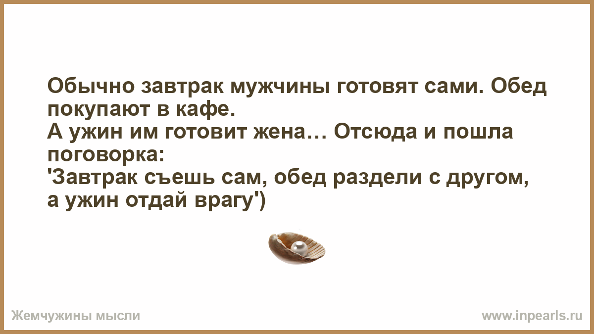 Обычно завтрак мужчины готовят сами. Обед покупают в кафе. А ужин им готовит жена… Отсюда и пошла поговорка: 'Завтрак съешь сам, обед раздели с другом, а ужин отдай врагу')