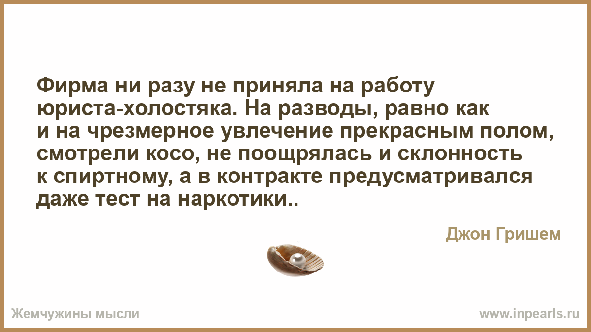 Фирма ни разу не приняла на работу юриста-холостяка. На разводы, равно как и на чрезмерное увлечение прекрасным полом, смотрели косо, не поощрялась и склонность к спиртному, а в контракте предусматривался даже тест на наркотики..