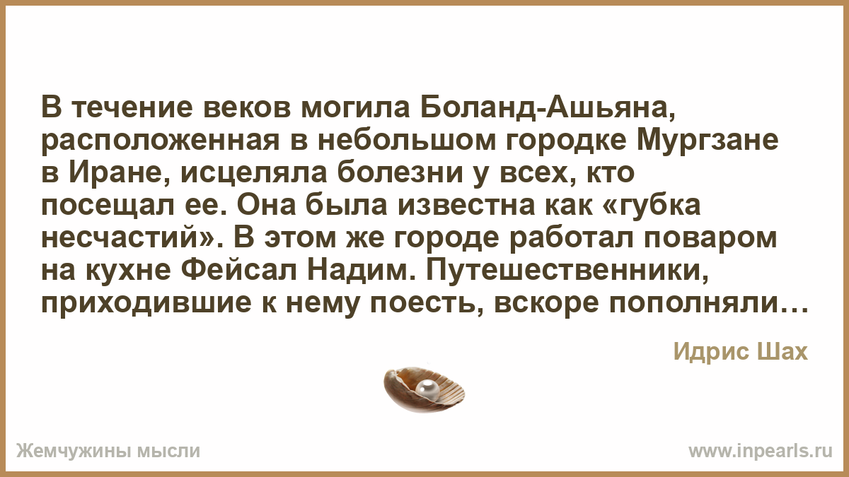 В течение веков могила Боланд-Ашьяна, расположенная в небольшом городке Мургзане в Иране, исцеляла болезни у всех, кто посещал ее. Она была известна как «губка несчастий». В этом же городе работал поваром на кухне Фейсал Надим. Путешественники, приходившие к нему поесть, вскоре пополняли ряды просветленных суфиев. А посетители гробницы никогда не становились суфиями и могли прославиться только среди невежд. Некто спросил мудреца Хоррама Али: — Почему благочестивые пилигримы не преображаются после посещения места стольких чудес? И почему завсегдатаи кухни становятся суфийскими святыми?