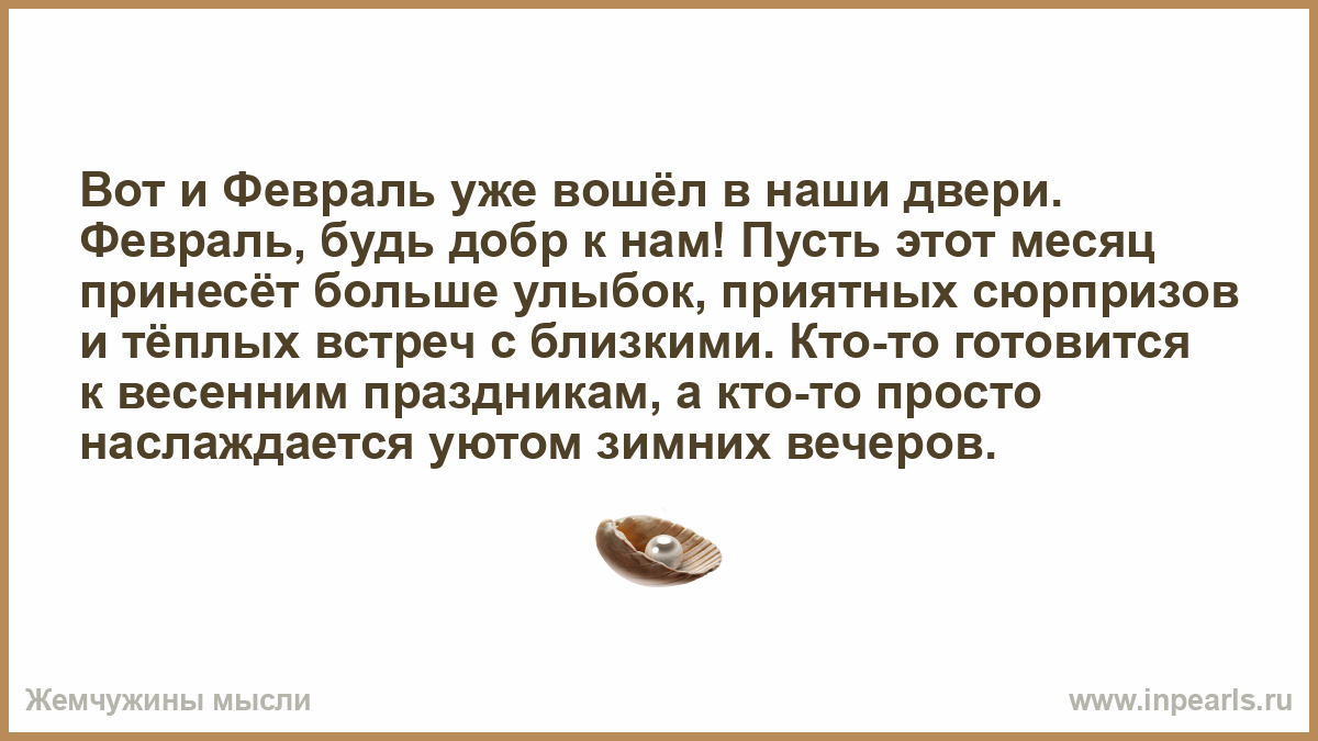 Вот и Февраль уже вошёл в наши двери. Февраль, будь добр к нам! Пусть этот месяц принесёт больше улыбок, приятных сюрпризов и тёплых встреч с близкими. Кто-то готовится к весенним праздникам, а кто-то просто наслаждается уютом зимних вечеров.