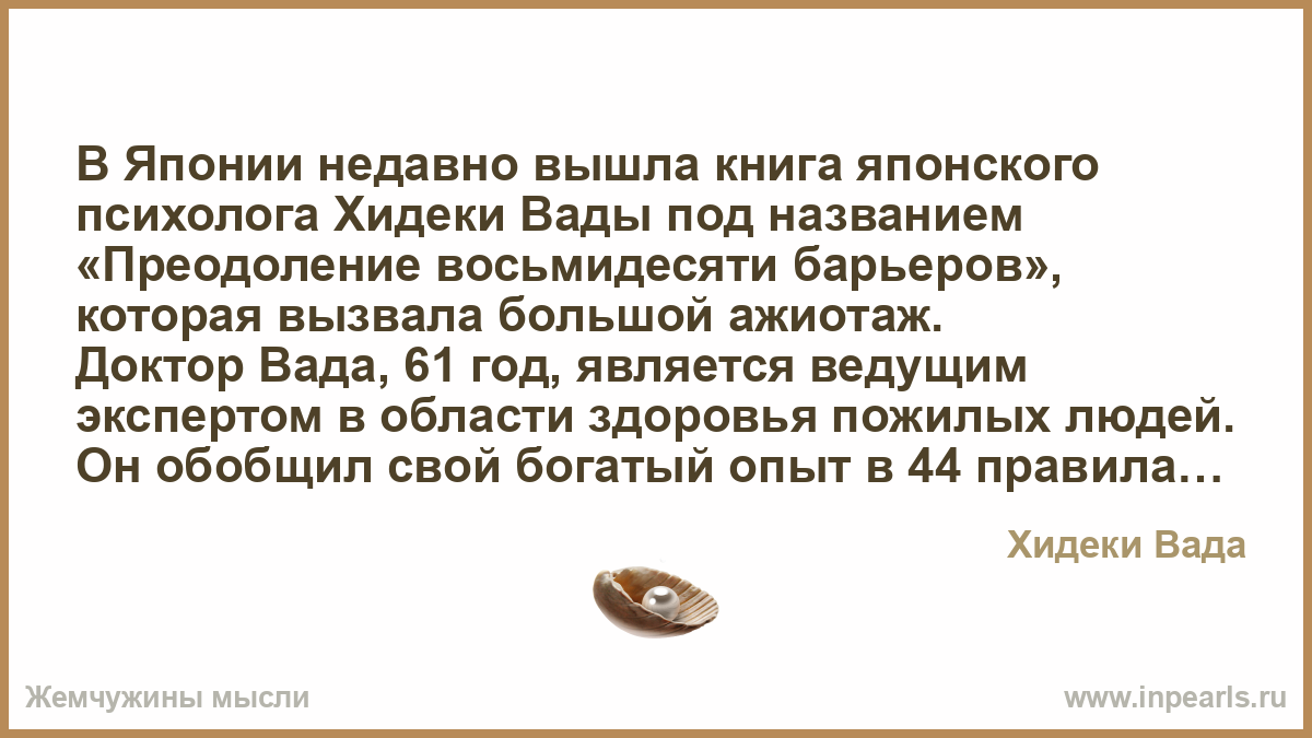 Японии недавно вышла книга японского психолога Хидеки Вады под названием «Преодоление восьмидесяти барьеров», которая вызвала большой ажиотаж.