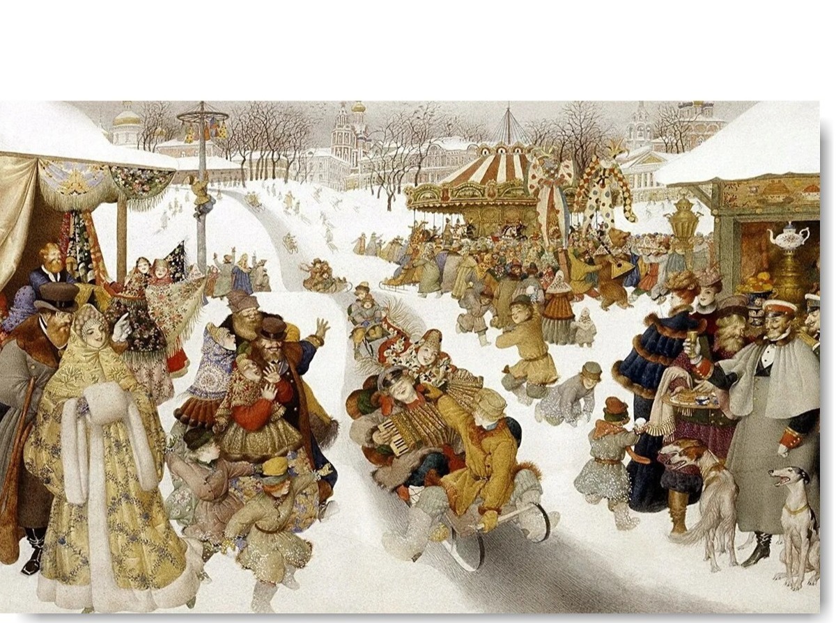 В центре — традиционная зимняя забава: огромная ледяная горка, съезд с которой доставляет участникам и зрителям немало разных эмоций. А вдоль нее люди катаются на санях, запряженных лошадьми, что тоже было неотъемлемой частью праздника. Возле трактира идет оживленный разговор, кто-то пьет, кто-то торгуется, а кто-то просто наблюдает за развлечениями.