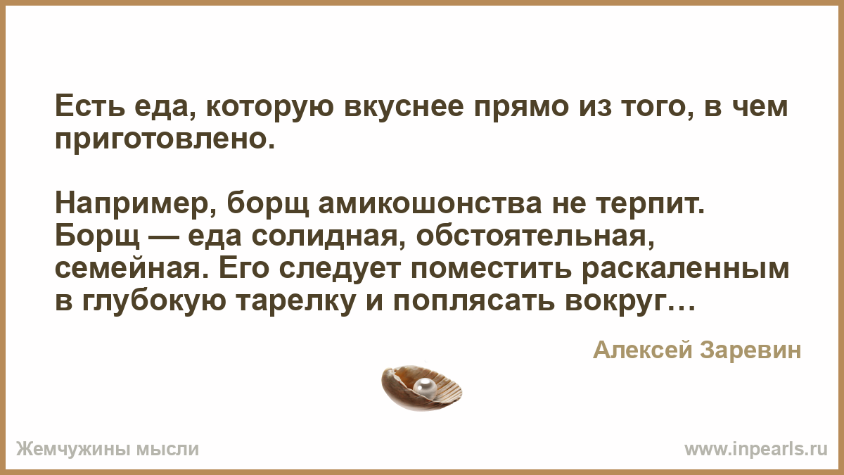 Например, борщ амикошонства не терпит. Борщ — еда солидная, обстоятельная, семейная. Его следует поместить раскаленным в глубокую тарелку и поплясать вокруг дополнительно — сметанки там, перчика, присыпать зеленушкой, чесноку выдавить свежего пару зубчиков, хлебца поджарить в тостере — и только тогда уже приступать, обжигаясь, обдувая, хлюпая и сёрпая.