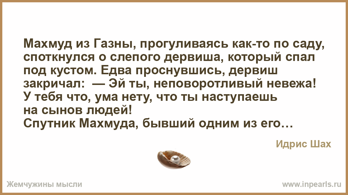 Махмуд из Газны, прогуливаясь как-то по саду, споткнулся о слепого дервиша, который спал под кустом. Едва проснувшись, дервиш закричал: — Эй ты, неповоротливый невежа! У тебя что, ума нету, что ты наступаешь на сынов людей!