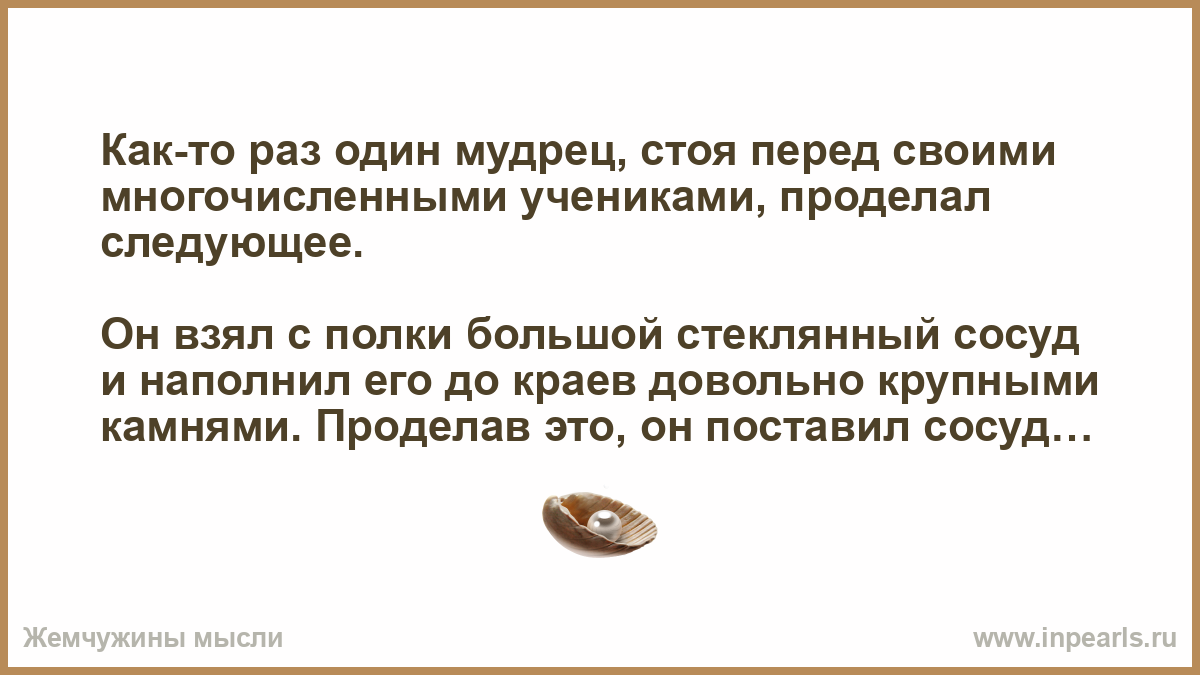 Он взял с полки большой стеклянный сосуд и наполнил его до краев довольно крупными камнями. Проделав это, он поставил сосуд на стол и спросил учеников, полон ли тот. Все подтвердили, что полон.