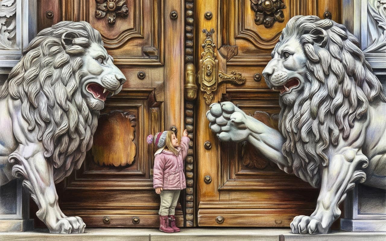 Дойдя до подъезда, девочка вынимает руку из маминой ладони и бежит здороваться со львами. Она ли такая маленькая, или львы такие большие, но макушка девочки как раз достаёт до приподнятой лапы Левого.
