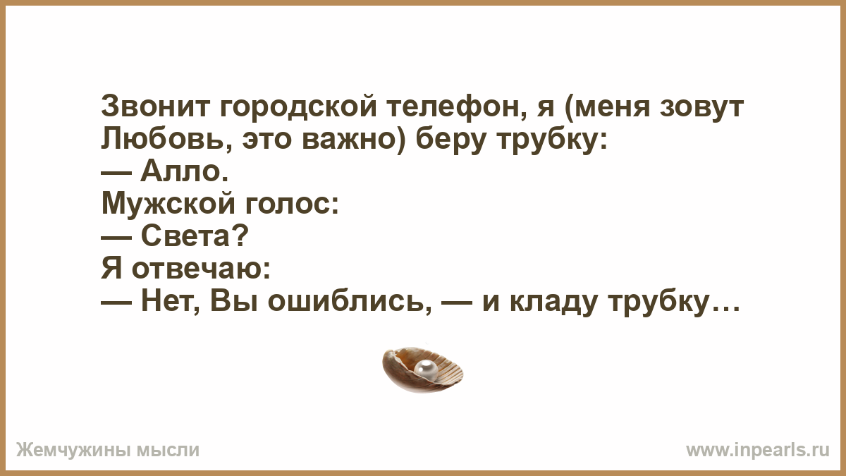 Звонит городской телефон, я (меня зовут Любовь, это важно) беру трубку: — Алло. Мужской голос: — Света? Я отвечаю: — Нет, Вы ошиблись, — и кладу трубку. Через полминуты опять звонок. Тот же мужской голос, но уже увереннее: — Галя…