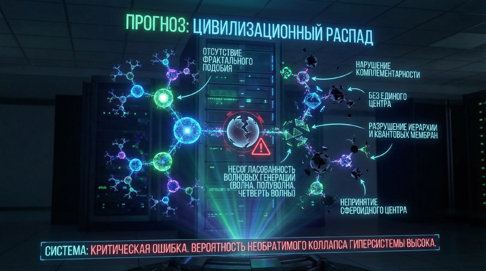 Нарушены все 6 принципов устойчивых гиперсистем. Без осознанной коррекции (вероятность 10−15%) траектория ведёт к коллапсу или перезагрузке через кризис.