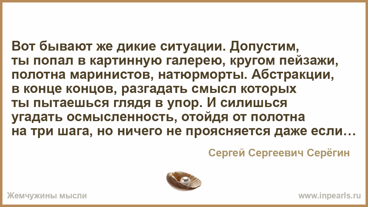 Вот бывают же дикие ситуации. Допустим, ты попал в картинную галерею, кругом пейзажи, полотна маринистов, натюрморты. Абстракции, в конце концов, разгадать смысл которых ты пытаешься глядя в упор. И силишься угадать осмысленность, отойдя от полотна на три шага, но ничего не проясняется даже если повернёшь голову, как сова вбок.