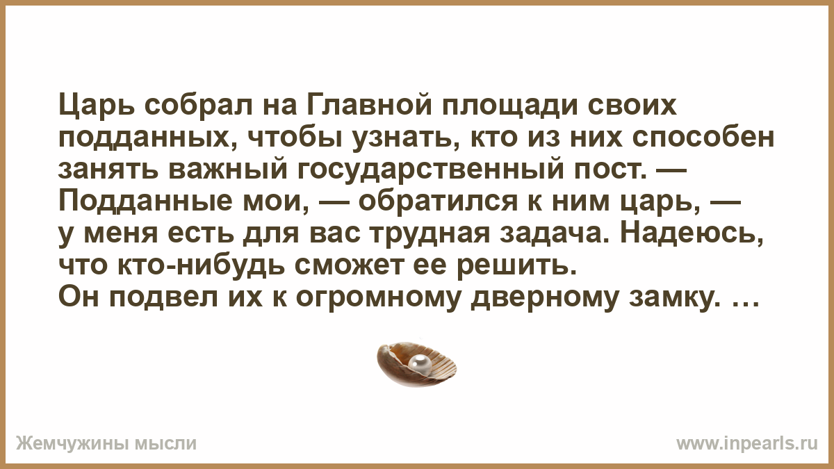 Царь собрал на Главной площади своих подданных, чтобы узнать, кто из них способен занять важный государственный пост. — Подданные мои, — обратился к ним царь, — у меня есть для вас трудная задача. Надеюсь, что кто-нибудь сможет ее решить.