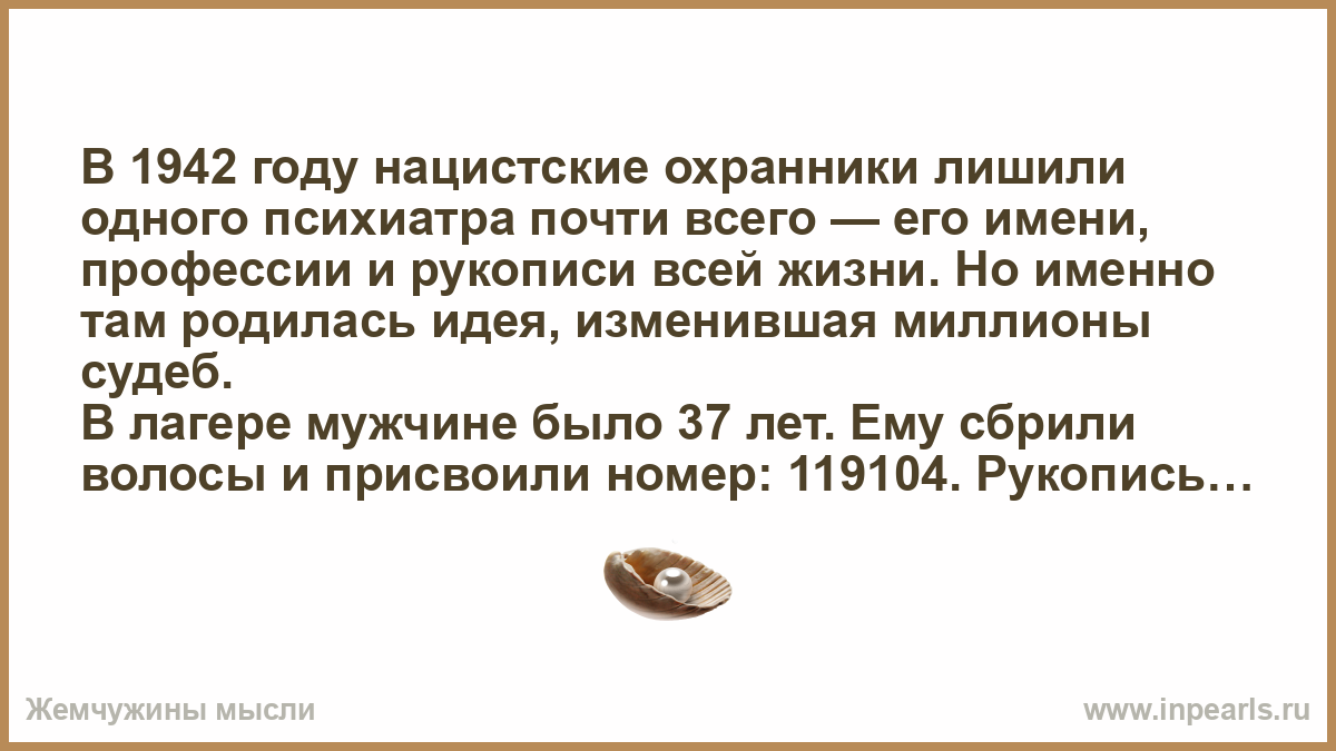 В 1942 году нацистские охранники лишили одного психиатра почти всего — его имени, профессии и рукописи всей жизни. Но именно там родилась идея, изменившая миллионы судеб.